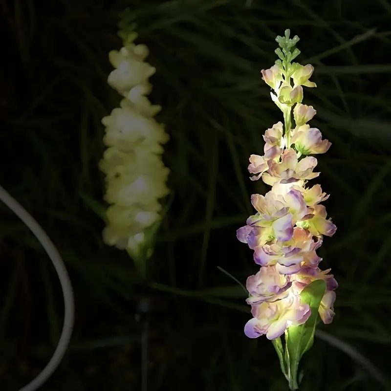 [Upgraded Solar Flower Lights Outdoor & 36 Bright LED Beads]The set features 4 solar delphinium flower lights in blue, pink, off-white, and purple, boasting realistic solar flowers. Equipped with sturdy garden stakes, solar lights outdoor are resistant to tilting or being blown over. Each solar lights outdoor has 9 LED beads; 4 pack solar flower lights outdoor totally have 36 LED beads. Our solar flowers outdoor waterproof are brighter than ordinary small LED beads, which make your garden more bright and attractive[Upgraded Bigger Solar Panel & Long Lasting]The solar flowers are powered by solar energy, with upgraded larger solar panel that absorb more solar energy. Our solar garden decor are more efficient than other solar flower lights outdoor. The solar lights outdoor are equipped with a more powerful 600 mAh rechargeable Ni-MH battery, whereas the others have only a 300 mAh battery. Solar garden lights outdoor can support capable of working continuously for 10-12 hours at night after fully charged[High Quality & Waterproof Garden Decor]The integration of high-quality fabric, resilient ABS material, and reinforced iron wire stems ensures that these solar lights outdoor for yard endure as a lasting and enduring enhancement to your garden decor or yard decor. These solar flower lights outdoor conform to IP65 waterproof standards, whether it's a sunny day, a rainy evening, or a frosty night, these solar flower lights outdoor will continue to enchant with their radiant glow[Easy Installation & Auto On/Off]The solar flowers outdoor waterproof are effortlessly set up and positioned upon unpacking. Garden lights for outside with no wiring or additional power source required, simply plant the solar flowers in your garden, flick the switch on, and indulge in the beauty of decorative solar flowers lights. The solar yard decor automatically charge during the day, and at night the garden decor for outside automatically illuminates to create a romantic and cozy atmosphere[Perfect Garden Decor for Outside & Pretty Gift]The solar flowers come to life, resembling real solar flower lights outdoor and bringing vibrant colors to your garden during the day. Solar lights outdoor garden automatically illuminate at night, fostering a romantic atmosphere. Ideal for outdoor decor in yards, patio, lawns, backyard, sidewalks, and pathways, these solar lights outdoor for yard also make a wonderful gift for Christmas, Mother's Day, Valentine's Day, anniversaries, and birthdays