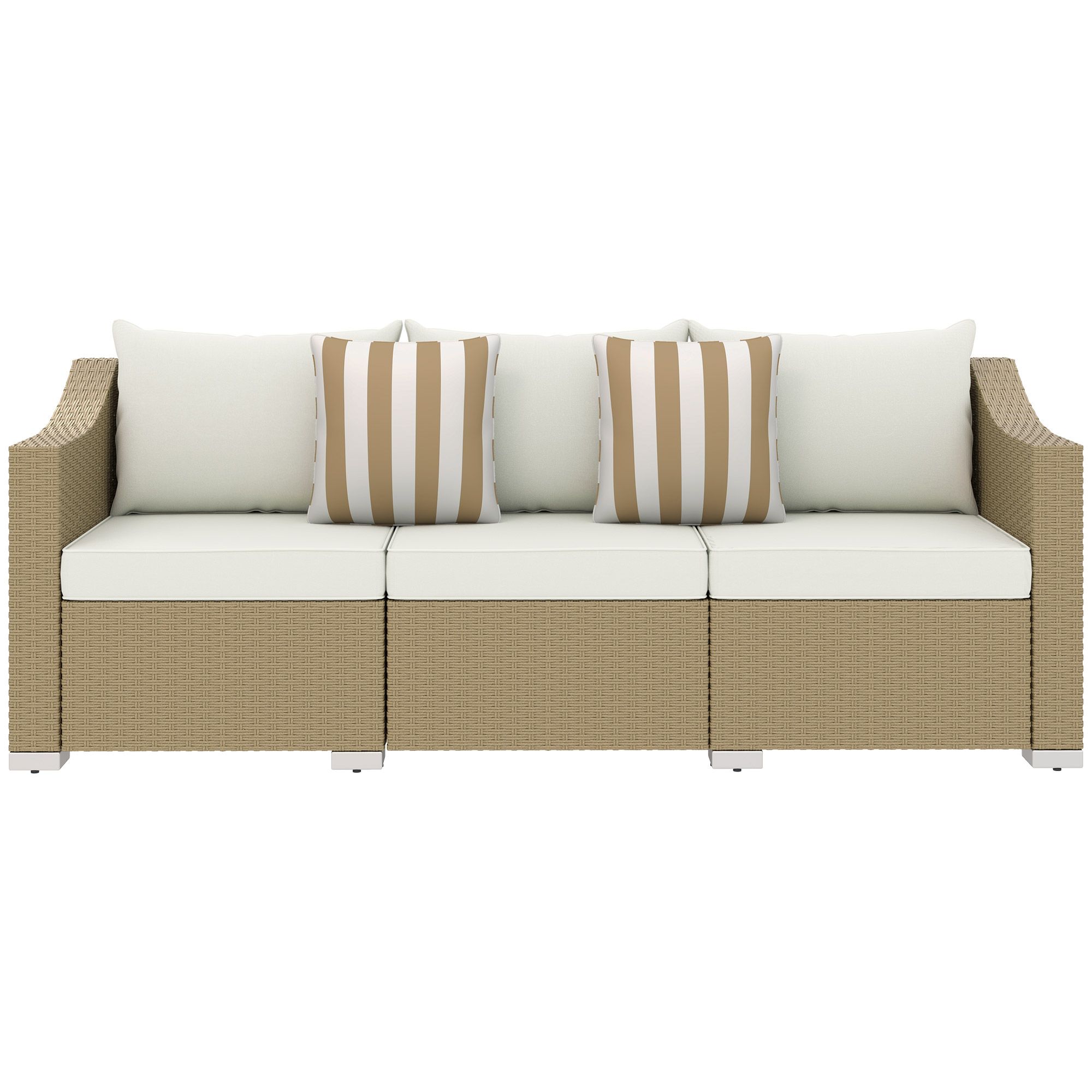 Discover the charm of the Outsunny rattan sofa, where hand-woven, all-weather plastic wicker meets plush comfort. Wrapped in water-resistant 180g polyester, this outdoor sofa makes a stylish addition for any patio or deck. Enjoy deep seat cushions and cozy throw pillows for relaxation in your backyard oasis. A great fit for any outdoor patio furniture collection!