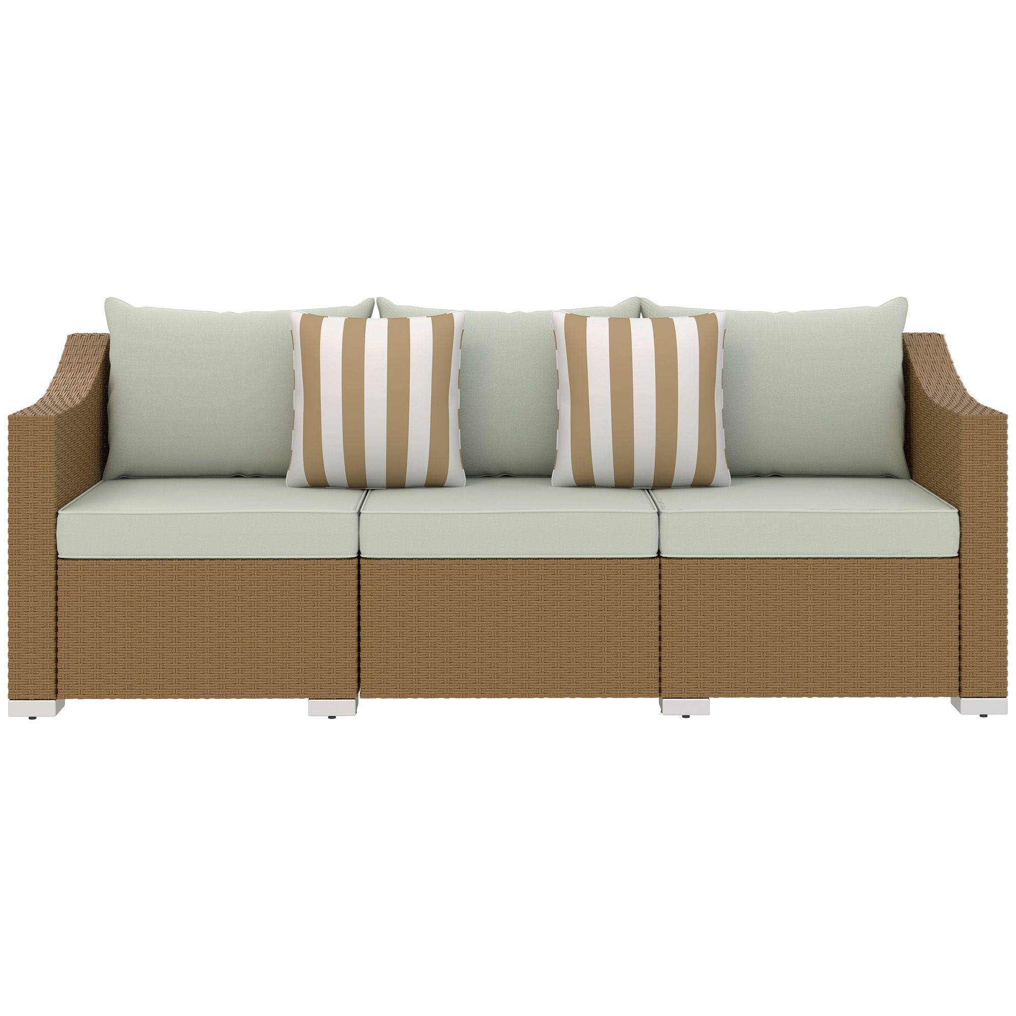 Discover the charm of the Outsunny rattan sofa, where hand-woven, all-weather plastic wicker meets plush comfort. Wrapped in water-resistant 180g polyester, this outdoor sofa makes a stylish addition for any patio or deck. Enjoy deep seat cushions and cozy throw pillows for relaxation in your backyard oasis. A great fit for any outdoor patio furniture collection!